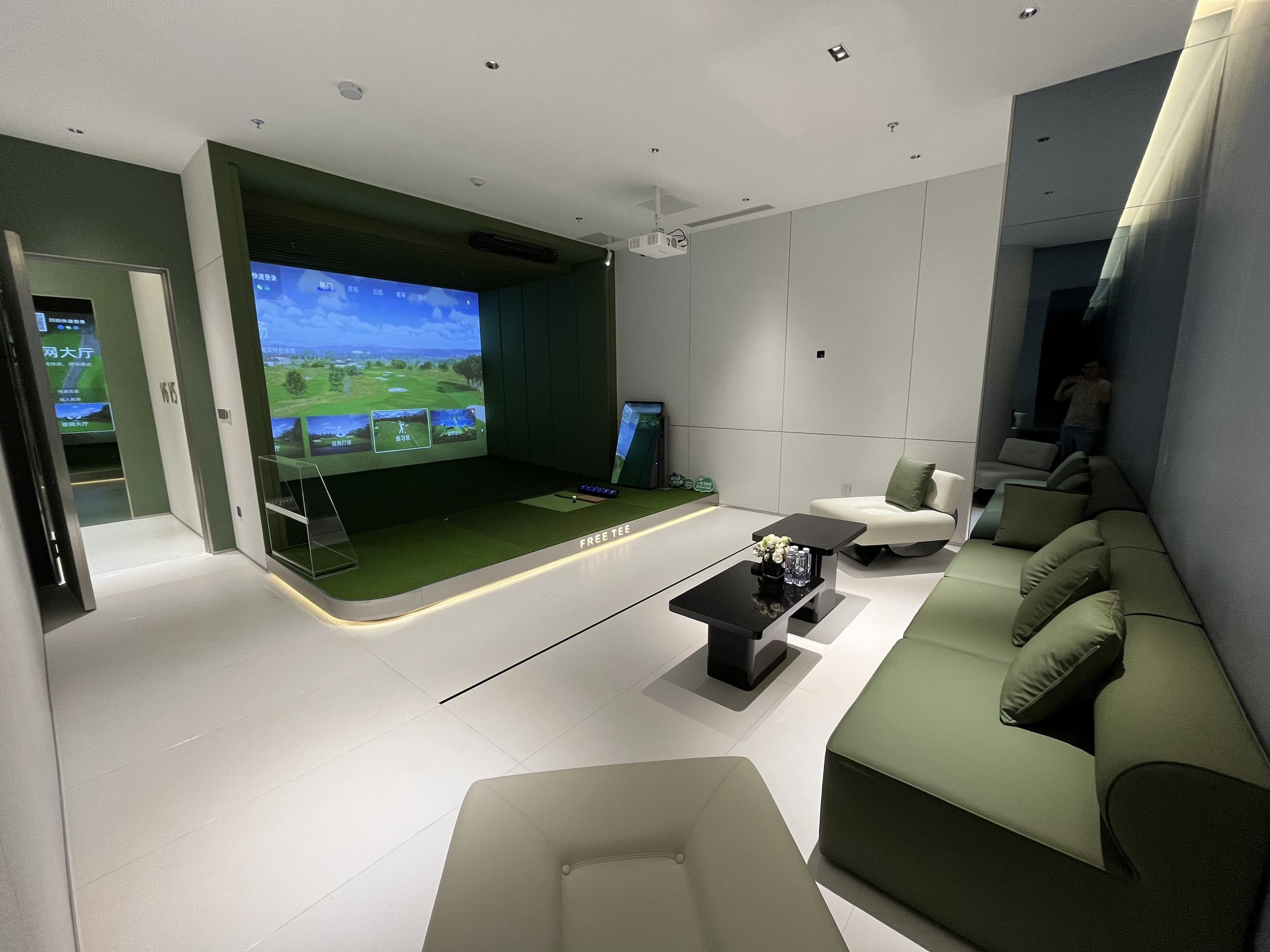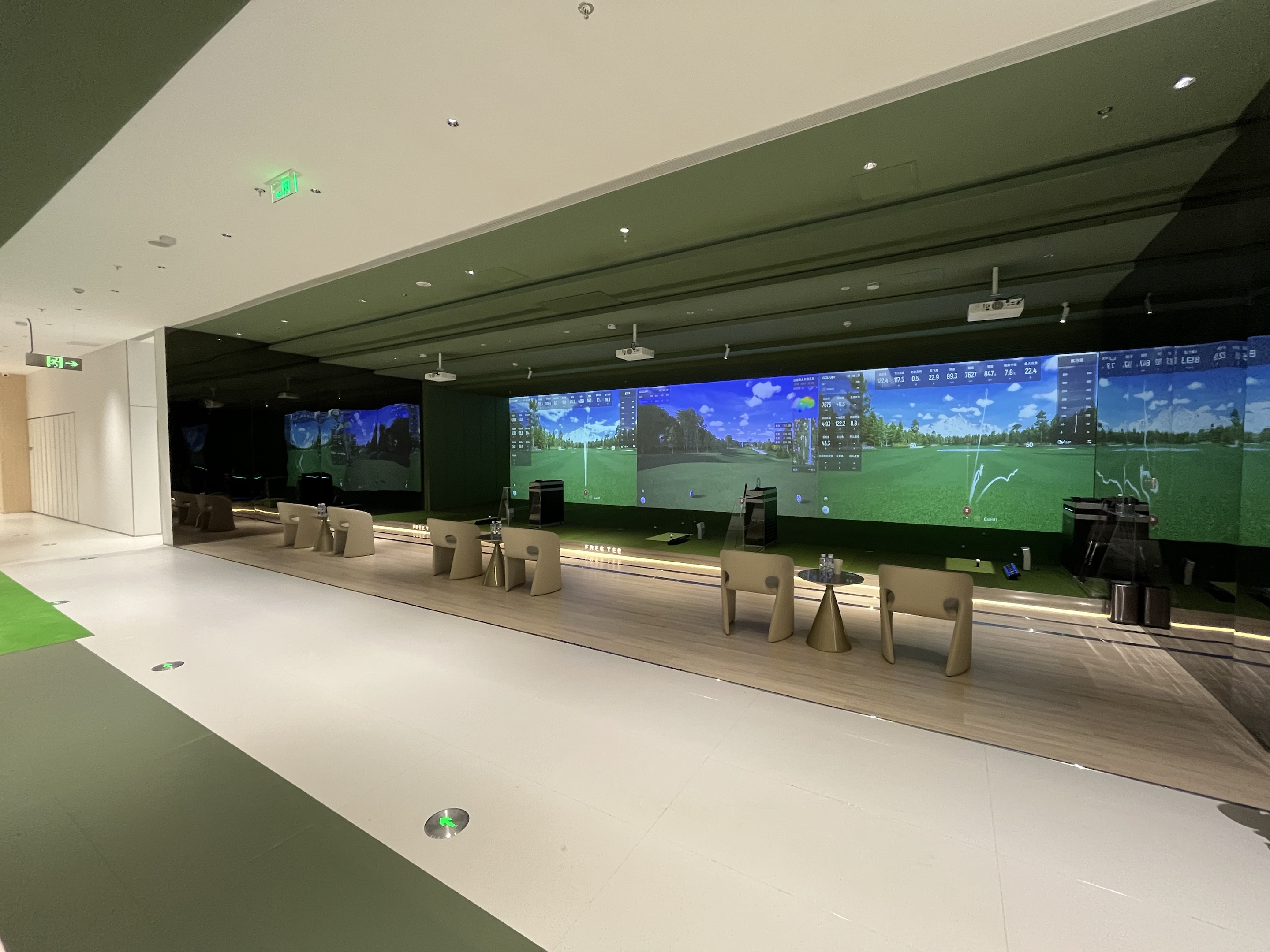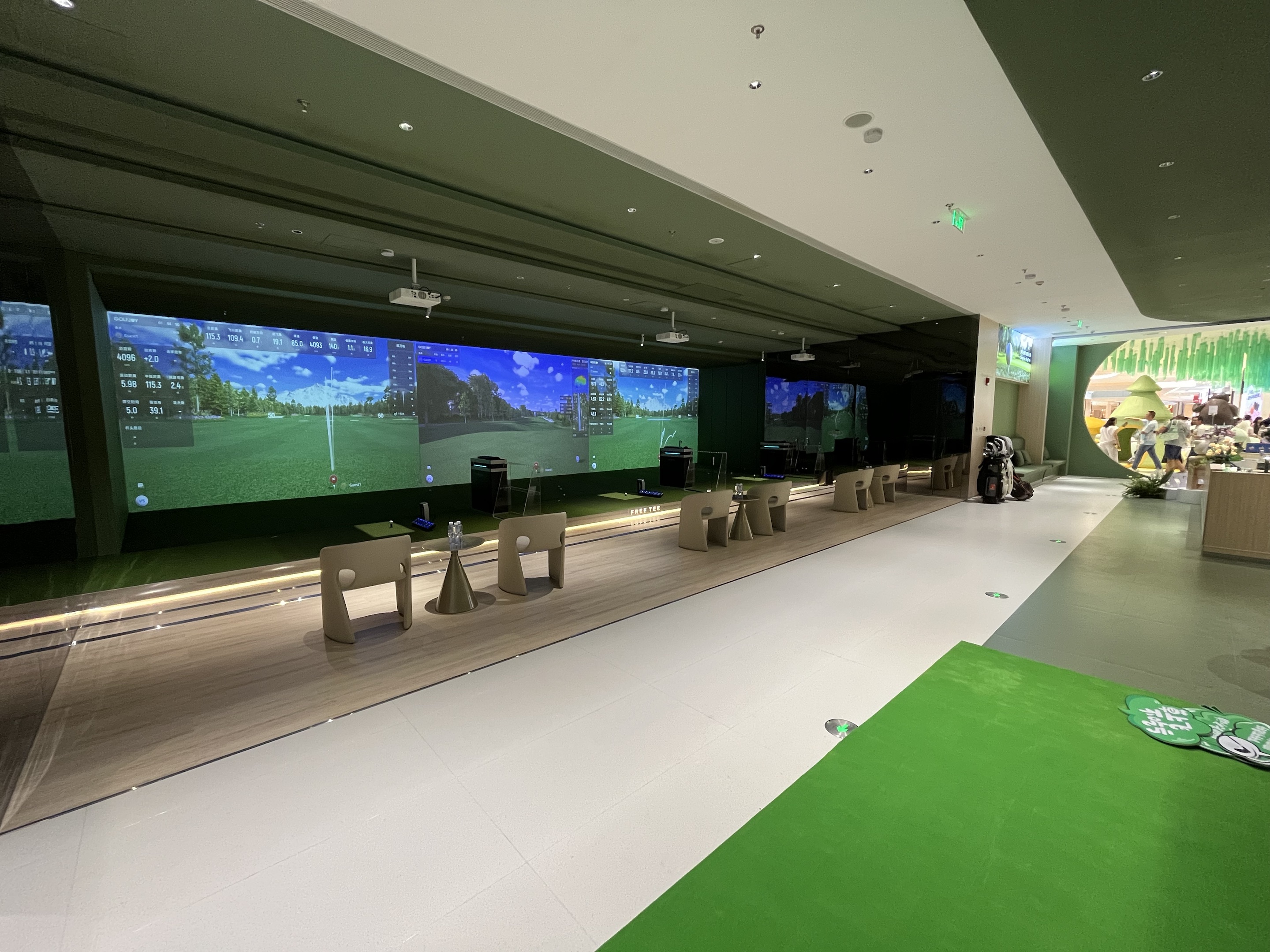 FREETEE荟聚店是上海的二店,坐落在上海荟聚商场的3楼,800平使用面积,配备了5个S95顶级包间和6个公共打位,全部是业内最尖端的衡泰信GOLFJOY系统,拥有1:1航拍的世界各地知名球场。